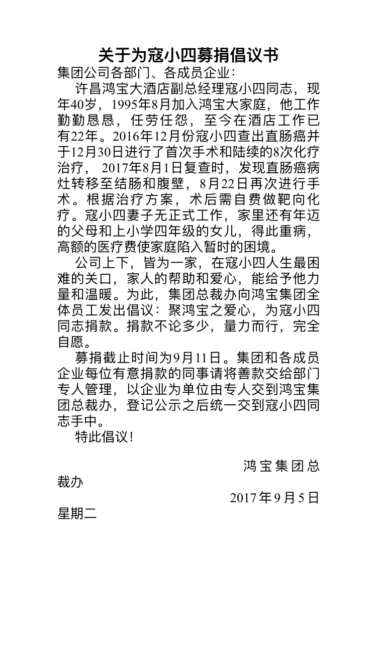 一人有難,八方支援。在得知寇小四同志的困難情況后,鴻寶集團(tuán)發(fā)出“為寇小四募捐倡議書(shū)”的號(hào)召。