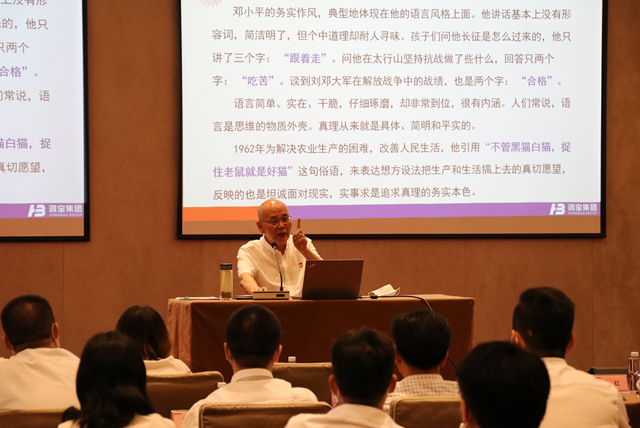 隨后,集團黨委書記鄧和平為全體與會人員講授黨課。本次黨課以“實事求是——黨的優良工作作風的靈魂”為主題,以生動的語言和翔實的事例論述了“實事求是”既是我黨保持強大生命力的不竭源泉,是中國革命和建設能夠取得成功的秘訣所在。通過解讀鴻寶集團近期發布的“安排工作講目標 落實工作講時效 請示工作講方案 匯報工作講結果”工作作風的精神內涵,進一步說明鴻寶集團在發展實踐中形成的求真務實、真抓實干的作風有著堅實的基礎,也得到了企業內外的高度認可,堅持“實事求是”的工作作風對個人的成長、企業的發展均意義重大,并呼吁黨員同志要發揮先鋒模范作用,寄語大家做一個求真務實的鴻寶人,奮力開啟屬于我們的黃金時代。全體參會人員認真聆聽,用心筆記,收獲滿滿。