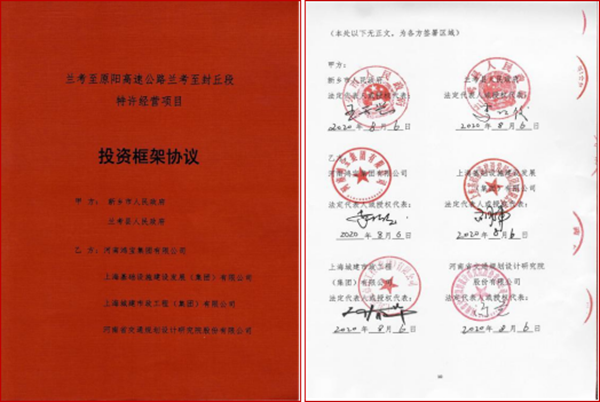 8 月 6 日,新鄉市政府、蘭考縣政府與河南鴻寶集團聯合體正式簽訂蘭考至原陽高速公路蘭考至封丘段特許經營項目(簡稱東壩頭黃河大橋項目)《投資框架協議》,本次簽約標志著河南鴻寶集團聯合體正式成為東壩頭黃河大橋項目投資主體,為項目開工建設及運營奠定了堅實基礎。