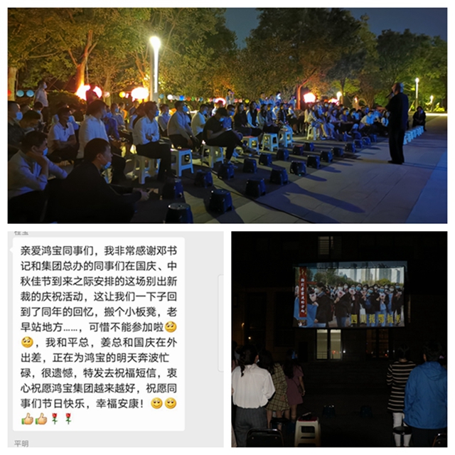 電影放映結(jié)束后,蘭考公司常務(wù)副總黃欽同志深情朗誦了宋朝大文學(xué)家蘇軾的《水調(diào)歌頭·明月幾時(shí)有》,集團(tuán)公司黨委書(shū)記鄧總帶領(lǐng)大家共同重溫了《十五的月亮》《敖包相會(huì)》《世上只有媽媽好》《歌唱祖國(guó)》等金曲,并代表在外為鴻寶事業(yè)奔波奮斗的的袁董事長(zhǎng)、平總集團(tuán)高管向大家致以節(jié)日的問(wèn)候。袁董事長(zhǎng)雖不能親臨活動(dòng)現(xiàn)場(chǎng),但仍通過(guò)微信工作群向全體鴻寶人發(fā)來(lái)節(jié)日祝福和紅包,袁董事長(zhǎng)回憶了童年觀看露天電影的美好回憶,與大家隔空相聚、共度佳節(jié),并衷心祝愿鴻寶集團(tuán)越來(lái)越好,祝愿鴻寶家人幸福安康!